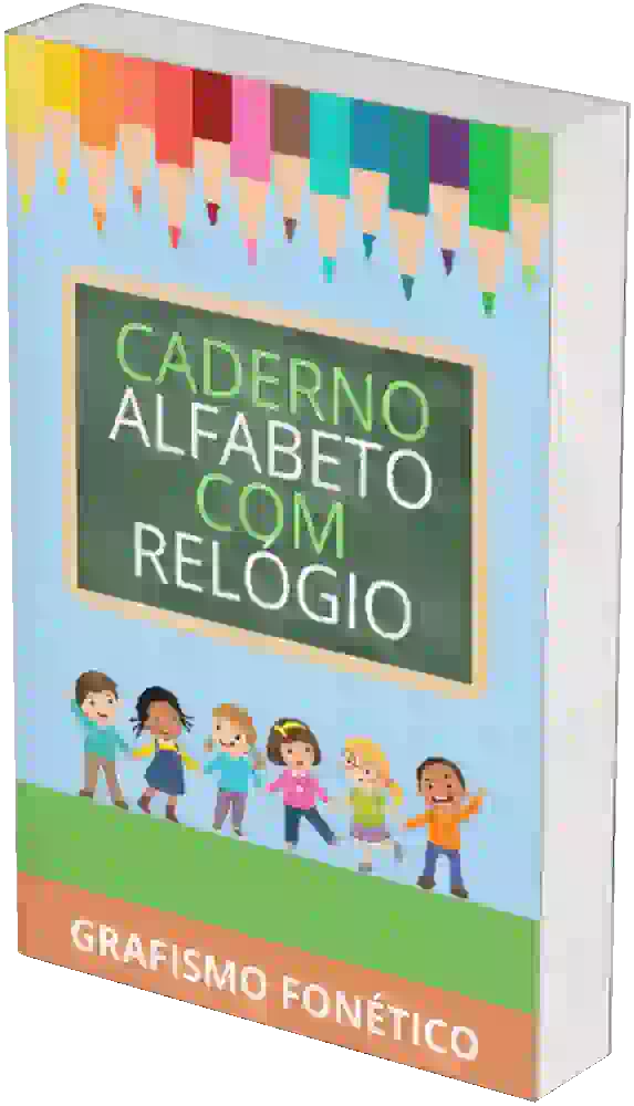 Caderno interativo que ensina as letras do alfabeto junto a um relógio, promovendo a leitura e noções de tempo de forma lúdica.