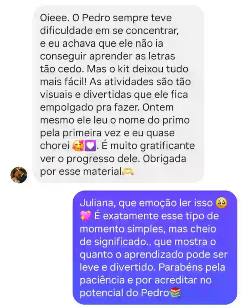 Cada criança tem seu tempo, mas muitas mães relatam resultados nas primeiras semanas, com o filho reconhecendo letras, sons e formando as primeiras palavrinhas.